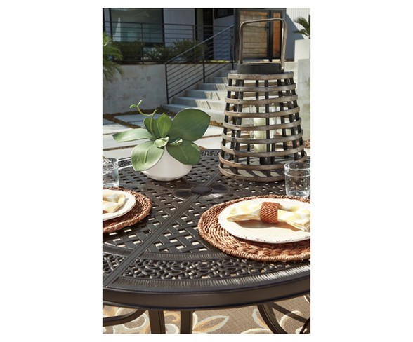 Description Burnella outdoor dining table's durable cast aluminum construction serves up plenty of style through the seasons. Round lattice top lends an elegant look and drains rainwater quickly away. Seats four. Signature Design by Ashley is a registered trademark of Ashley Furniture Industries, Inc.Features: Round (shape)Seats up to: 4Dimensions (Overall): 28.38 inches (H) x 48 inches (W) x 48 inches (D)Care & Cleaning: Spot or wipe cleanMaterial: Cast Aluminum (Frame)Tabletop Material: Cast AluminumWeight: 151 poundsExtension Table: NoAssembly Details: Adult assembly required, tools not providedProtective Qualities: Rust-resistantFrame Color: BrownTabletop Thickness: .75 inchesWarranty: 1 year limited warranty. To obtain a copy of the manufacturer's or supplier's warranty for this item prior to purchasing the item, please call Target Guest Services at 1-800-591-386942" x 72" rectangular dining tableSeats 6Hand-painted glass tabletopRust-resistant aluminum frame with durable powdercoated finishUmbrella hole; cap includedAssembly required Estimated shipping dimensions: 50.5INCH X 3.25INCH X 50.5INCH DPCI : 009-00-7776 UPC : 024052379334 TCIN : 52233887 Estimated shippimg weight: 151.0POUND