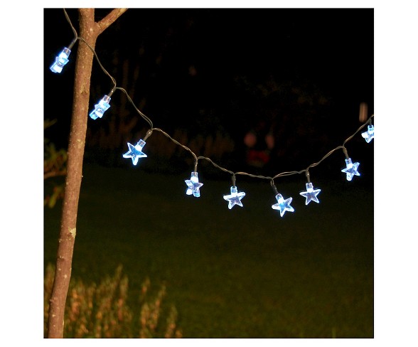 Description Add a sophisticated touch to your backyard, porch or garden with glowing star solar string lights. Illuminate a garden party, birthday bash, or an elegant wedding reception. These lights are not limited with cords or plugs, so you can hang them in places to perfectly accent their surroundings. They have a built-in solar panel and come with 1 rechargeable battery. These pieces collect direct sunlight all day, and will glow up to 6-7 hours everyday.Light Bulb Count: 30Number of Pieces: 1Overall Length: 13 feetWeight: 1 poundsFeatures: Stay-Lit Bulbs, On/Off Switch, light sensitiveIncludes: Ground Stake, InstructionsLighting Effects: Constant light (no effect)Indoor/Outdoor: OutdoorAssembly Details: Adult assembly required, no tools neededLight Bulb Color: WhiteNumber of light settings: 1Lighted length: 13 feetCord lead length: 12 inchesWire Color: GreenLight bulb shape: 3mm (LED)Bulb Spacing: 4 inchesLight Bulb Type: LEDMaterial: Plastic, WirePower Source: Solar-poweredBattery: 1 AA Nickel metal hydride, Required, includedWarranty: 1 year limited warranty. To obtain a copy of the manufacturer's or supplier's warranty for this item prior to purchasing the item, please call Target Guest Services at 1-800-591-386930 Mini Solar Powered Star LightsCord Length: 156"Outdoor Use OnlyLight Time: 6-7 Hours Estimated shipping dimensions: 3.0INCH X 3.0INCH X 9.0INCH DPCI : 053-21-4473 UPC : 715844376012 TCIN : 50790969 Estimated shippimg weight: 1.0POUND