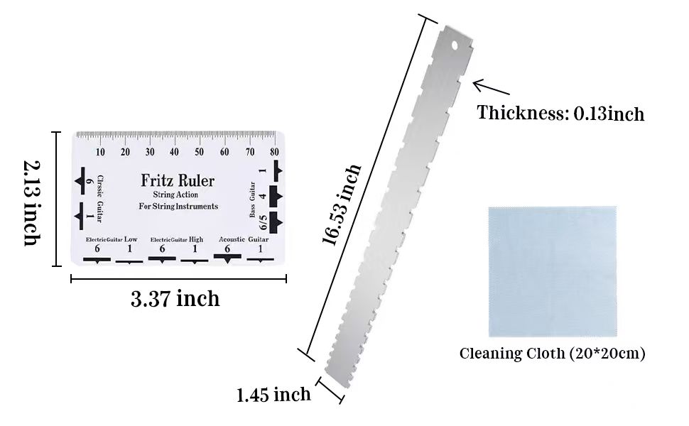 The package includes 1 Guitar Neck Notched String Measurement Ruler and 1 String Action Ruler. Perfect accurate action measurements for string instruments such as guitar, bass, mandolin, banjo, etc.Guitar Neck Notched Straight Ruler - Made of stainless steel, rustproof, sturdy enough for your long-term use. Size: 16.5 x 1.45 x 0.13 inch, Weight: 230g. Dual scale design, works well with most guitar, specially suits for Gibson(24.75") and for Fender(25.5") electric guitars