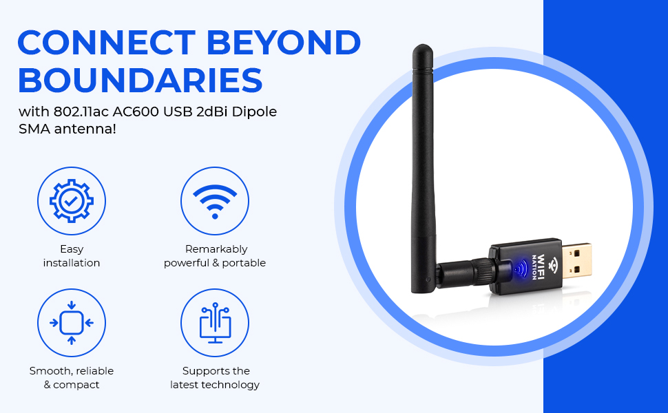 The USB WiFi Adapter AC600 with Realtek RTL8811AU chipset delivers dual-band 2.4/5 GHz wireless connectivity up to 600Mbps. Featuring an external 2 dBi SMA antenna, it ensures strong and stable signal reception. Compatible across Windows, Mac, and Linux, this plug-and-play adapter is designed for reliable, high-speed internet access in any professional setting.