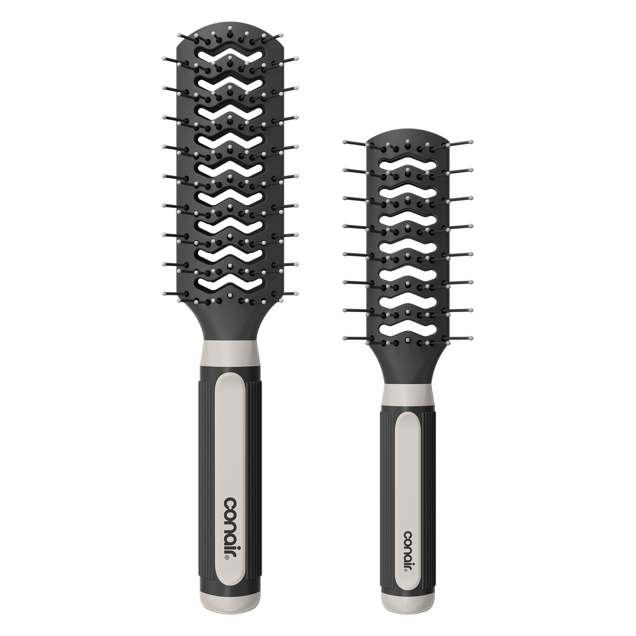 The Conair Professional Hair Brush Set includes one full-size and one mid-size vented brush designed for faster blow-drying and versatile styling. Featuring ball-tipped nylon bristles for snag-free detangling and soft ridged grips for comfortable control, this compact set is perfect for all hair lengths and ideal for on-the-go touch-ups. Made in the USA, it combines salon-quality performance with travel-friendly convenience.