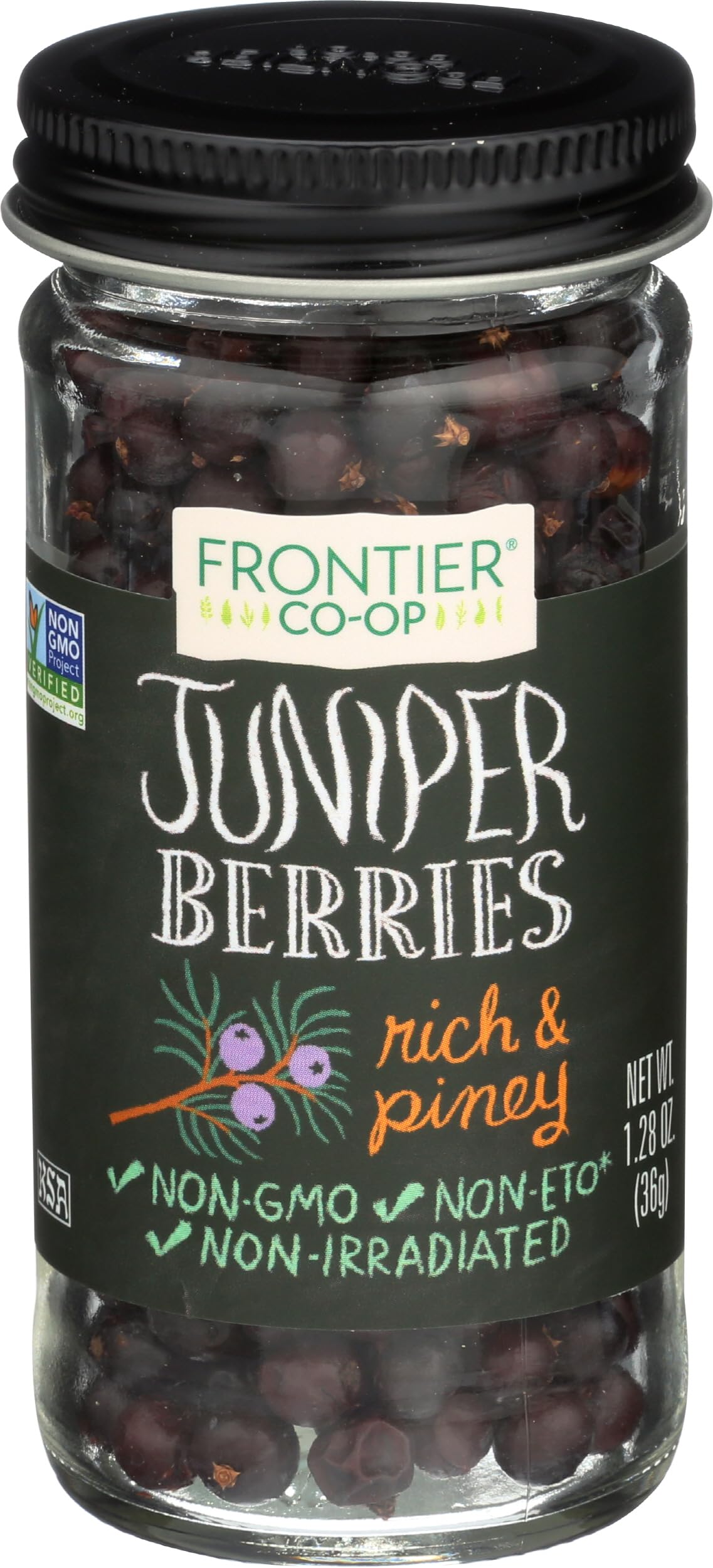 Frontier Co-op Whole Juniper Berries come in a 1.28-ounce bottle, delivering a piney-sweet flavor ideal for bitters, meat stews, sauces, and marinades. These kosher, non-irradiated berries are sustainably sourced from a member-owned cooperative, ensuring quality and environmental responsibility.