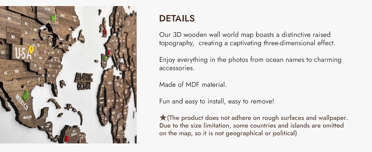 This multilayered 3D wooden world map measures 54.1 x 100.08 cm and weighs just 1.07 kg, offering a lightweight yet visually impactful wall décor piece. Crafted from natural wood with a modern, unfinished finish, it highlights states and capitals, making it an ideal gift for travelers and a sophisticated addition to any home or office.