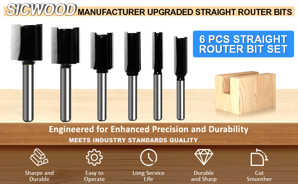 The SICWOOD 6Pcs Straight Router Bit Set features carbide-tipped, double flute bits with a 1/4 shank, designed for a variety of woodworking tasks. With cutting diameters ranging from 3/4" to 1/4" and a cutting height of 13/16", these bits are perfect for jointing, grooving, and creating rabbets in materials like chipboard, MDF, plywood, and hardwood. Ideal for use on CNC machines and handheld routers, this set combines quality and versatility for all your woodworking needs.