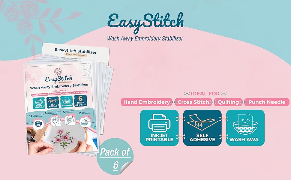 EasyStitchStudio.com 06 Pcs Stick n Stitch Embroidery Paper Sheets – 8.5” x 11” Water Soluble Stabilizer for Embroidery – Adhesive Stabilizer for Transferring Embroidery Patterns