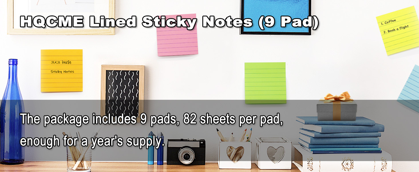 HQCME (9 Pack) Lined Sticky Notes 3x3 in Post Sticky Notes with Lines,9 Pastel Colorful Ruled Super Sticking Power Memo Self-Stick Note Pads,Sticky Notes Lined for Office,School,Home,82 Sheets/Pad