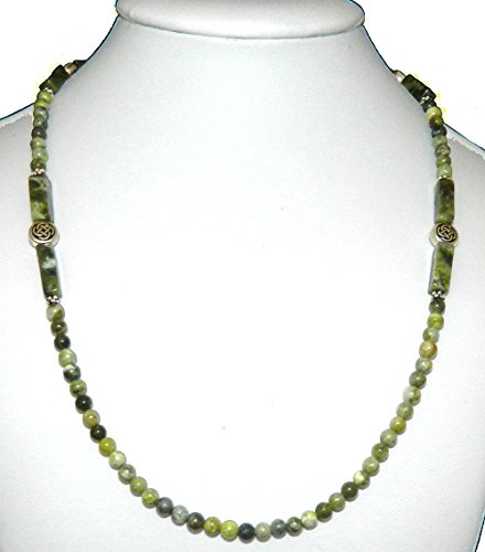 Different shades of Green in Irish Connemara Marble Beaded necklace, There are 10 oblong blocks, each is 1/2" long X 3/16". The beads are approx 3/6". The blocks have a silver tone Celtic design bead between them. The necklace is handcrafted by All That Glisters. This marble is from the west of Ireland. It is over 600 million years old. It's color symbolizes Ireland It is said to bring luck and serenity to those who keep it close. 18"