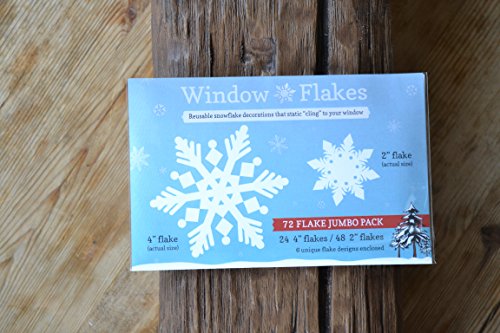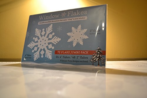 The 72 Flake Jumbo Pack of snowflake window decal clings is perfect for that large set of windows or multiple storm / patio doors. This pack features the following assortment of snowflakes: 24, 4" snowflake window clings 48, 2" snowflake window clings Like every snowflake, our Window Flake snowflake clings are unique in design. Simple to use, just peel the snowflake clings from the vinyl backing and place them onto your window in any design you like, if you want to rearrange them, simply peel them off and move them around. Our snowflakes cling to your windows without adhesive or glue, and remember, save the vinyl backing so you can peel the snowflakes off the window at the end of the season and store them for next year. These beautiful reusable snowflake clings will spruce up any window and help put the finishing touches on your holiday decorations. If you are looking for a smaller quantity of snowflake clings or a larger sized snowflake cling, you may want to try the following: 36 Flake Combo Pack: 48, 2" snowflake clings + 24, 4" snowflake clings OR for larger snowflake cling sizes: 6 Snowflake Cling Pack of 6" Flakes 4 Snowflake Cling Pack of 8" Flakes 4 Snowflake Cling Pack of 12" Flakes All snowflake clings are white in color and do not melt, crack or fade.