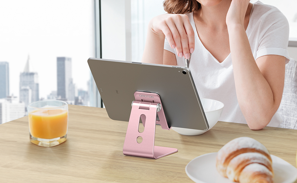 OMOTON Phone Stand for Desk, Larger and Exceptionally Stable, Adjustable Mobile Phone Cradle Holder Dock with Bigger Body & Longer Arm, Compatible with iPhone, Tablets (7-10") and More, Rose Gold