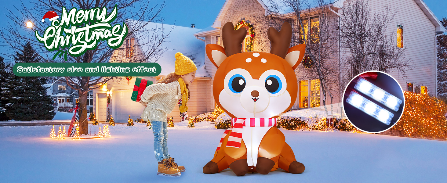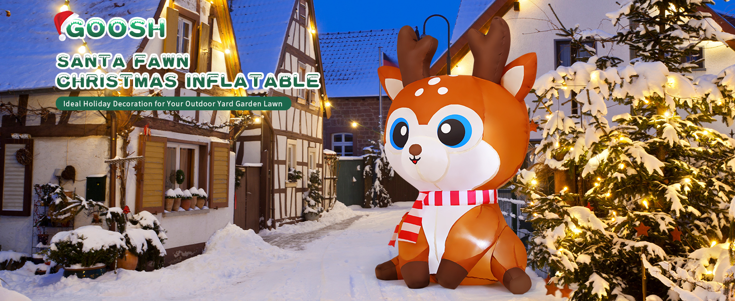 The GOOSH 5 FT Christmas Inflatable Reindeer is a charming outdoor decoration featuring built-in LED lights and a festive scarf. Crafted from waterproof polyester and equipped with a fast-inflating, CE & UL-certified fan, it promises quick setup and durability through all weather conditions. Complete with all necessary accessories for easy installation and storage, this reindeer is a reliable, eye-catching centerpiece for your holiday décor.