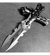 The MADSABRE is a modern, ambidextrous folding pocket knife featuring dual 3.5-inch 440C stainless steel blades that open independently. Its lightweight aluminum handle with textured grooves ensures a secure grip, while a reliable liner lock guarantees safe use. Equipped with a pocket clip, this 8.5-inch knife is designed for easy carry and versatile outdoor or everyday tasks.