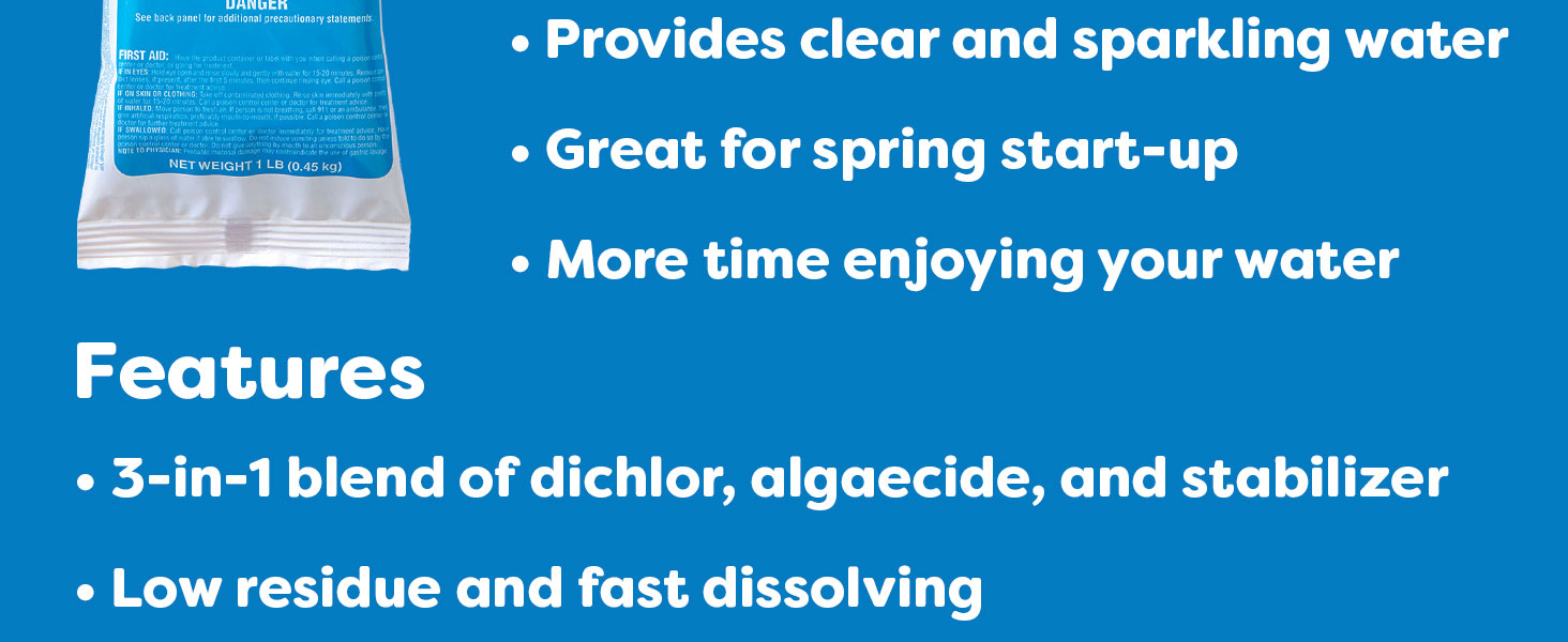 In The Swim Premium 3-in-1 Pool Shock - Di-Zap is a powerful swimming pool cleanser that combines 99% Sodium Dichlor, an algaecide, and a stabilizer to ensure your water remains clear and safe. Ideal for all water features, this fast-dissolving formula prevents chlorine burn-off with its UV inhibitor, making it the perfect choice for maintaining pristine water quality.