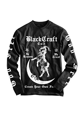 Blackcraft Cult's In Reason We Trust Long Sleeve Tee is an awesome gothic style alternative long sleeve top. The front print features the brand's logo and occult symbolism including pentagrams, a goat and crescent moon. The sleeve print reads 'One Life God Free'.