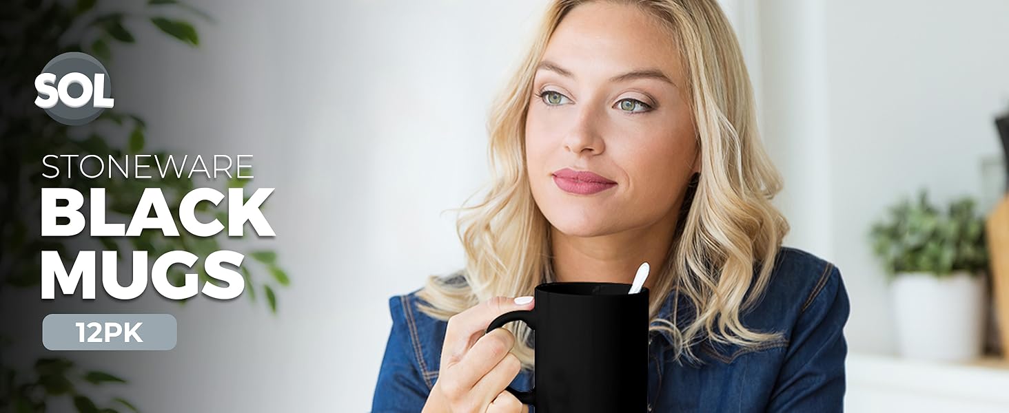 The SOL 12-pack black stoneware mugs offer a modern minimalist design with durable 11oz capacity cups that retain heat well. Perfect for home, office, or café use, these microwave and dishwasher safe mugs combine style and practicality in a stackable set ideal for everyday use or gifting.
