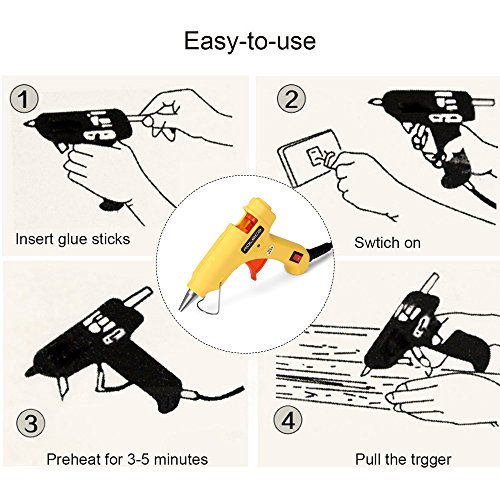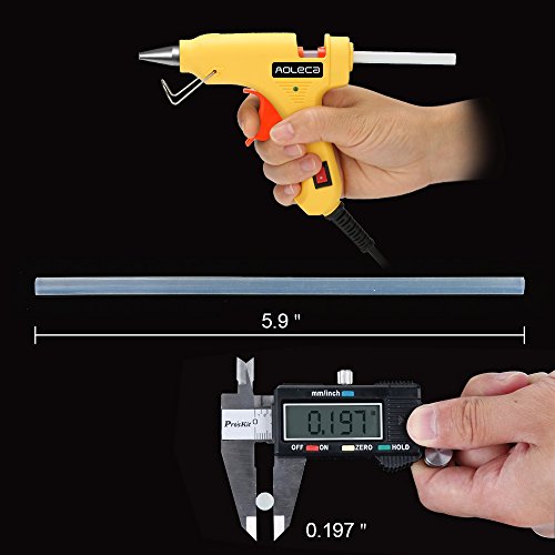 The glue sticks come with the Aoleca Melt Glue Gun Kit is environmental-friendly, it has super strong adhesive when glue between 2 different parts, but easy to clean when forced apart these 2 stickup parts, it will always keep your items clean.Specification:About hot melt glue gun:Material: Plastic & AluminumWorking power: 20WWorking voltage: 100 to 230VWorking temperature: 356 to 392℉Nozzle diameter: 0.070-0.078 inchWarm-up time: 3-5 minutesCable length: 47 inchSize: 5.1 inch*4.3 inch*1 inchColor: YellowAbout glue sticks:Color: TransparentPackage: Simple PackingCure time: 10-20SSize: 0.27-0.29 inch (diameter)*10 inch (length)Warm Tips:1. To avoid get an electric shock during using, do not use in humid environment and keep it away from children.2. The remaining pressure inside the glue gun will push a little molten glue out of the gun even stop use, so to save your glue, please control release the trigger or cut off the power in advance.3. Cut off the power when stop using.4. The nozzle and the glue liquid are hot when the gun is working, please don't touch it.5. If the glue gun doesn't work for 15min, please cut off the power source to avoid the melting glue recirculating or damage.6. Please let the bracket stand to cool down the gun for several minutes after use, and don't change the other power cord with it.7. If the strip is left after use, please don't pull it off, just let it in the gun for the next use.Packing List:1* Melt Glue Gun30* Glue Sticks