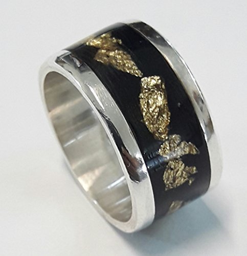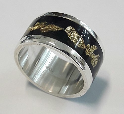 Silver 925 Ring with black resin and gold flakes, with personalized text. A silver 925 ring handmade, exquisitely covered with blue resine and gold flakes . Because they are handmade, might have slight variations with respect to the picture. The ring is made to the size of the customer when is ordered. The customer can request the width of the ring, 8-10 mm. All rings can have a personalized text on the inner side, without this increase its price.