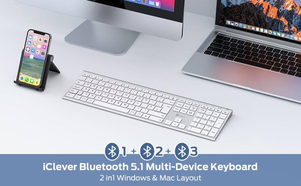 The iClever BK23 Bluetooth Keyboard combines cutting-edge Bluetooth 5.1 technology with a rechargeable USB-C battery that lasts over a month per charge. Its full-size layout includes a numeric keypad and 12 shortcut keys, designed for seamless multi-device use across Mac, Windows, iOS, Android, and Chrome OS. The low-profile scissor-switch keys ensure a quiet, comfortable typing experience, making it the perfect wireless keyboard for professionals who demand efficiency and style.