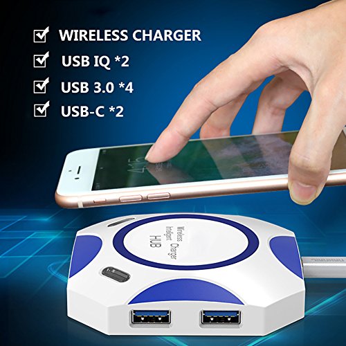 Description: Smart Charging: The USB C 3.0 HUB supports wireless charging & WPC (5W) Qi charging. And it is very safe because of the Type C HUB with foreign body detection. The charging efficiency is up to 75%. The USB HUB also support Ti, IDT, PANASONIC and etc. Brief Instructions: 1. Connect the USB data cable to the power adapter or computer. 2. Connect the Type-C connector to the wireless charger. 3. Put your mobile phone or other device with a wireless charging receiver onto the wireless charger. 4.If the mobile phone or other device without a wireless charging receiver,pls assemble one on it. NOTE: * Data port is for connecting PC or other device * DC Voltage:5V/2A+ * SW is the power switch for turning On/off the wireless power supply; Specification: HUB: Wireless Charge+ QI USB*2 + USB 3.0*4+ USB C*2 Application: Smart phones Support wireless Charge, or Smart Phone with wireless charging Adapter Sensing Power: 5W(5V 1A) Sensing Distance: 0-8mm Operating voltage: 4.5 V to 5.5 V Working current: more than 1.5 A Rate Parameter: USB 3.0> 100MB/s, USB 2.0>40MB/s Dimension: 8.4*1.9*8.4cm Package List: 1* USB C HUB 1* USB C Cable