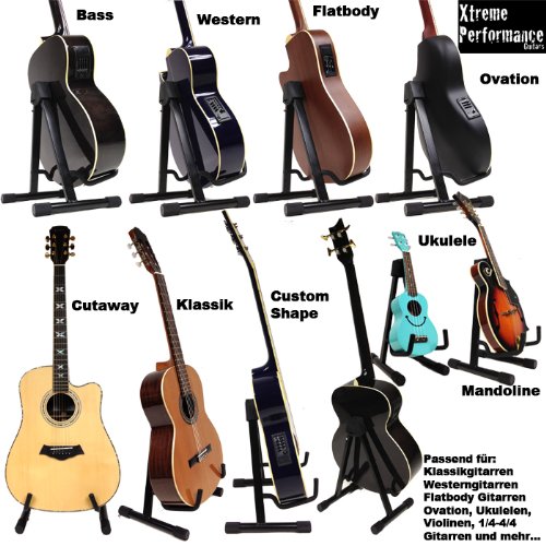 Stable A tripod for, ukuleles, acoustic guitars and other stringed instrumentsOur popular guitar a stand - now with new adjustable system for rapid adjustment and fold away without having to screws. Ingenious for home or on the move.The rubber pad surface keeps the guitar shape securely and non-slip where you be. Suitable for all guitar shapes due to limitations in photography and the inevitable differences in temples with attachment for acoustic string Isntrumente. Any guitar securely attached to here. Better fit and comfort it does not more.Here are the details: Sturdy suitable for all types of guitar and bass. Easy to fold down adjustable system for rapid adjustment, without screws Also suitable for children's instruments. High-quality workmanship contact surfaces with protective lightweight- Footrest:Footstool supports the correct and healthy posture when playing the guitar.The foot rest is adjustable in 4 levels. It is young and old and large to small adjustable and suitable for any guitarist.The surface is rubber and can be easily wiped clean. The 4 feet are also rubberised to avoid slip.- 1 set of ukulele strings of Xtreme Performance- Picks:6 picks, different sizes and various colours