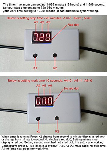 The timer maximum can setting 1-999 minute (16 hours) and 1-999 second, So your stop time setting to 16 hours or 12 hours, your work time setting to 10-20 second, It can automatic cycle working.