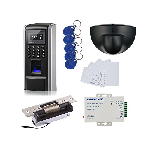We provide video guide+Detail wire diagram, so you can easily setup System, also provide on line live support.We will do express shipping to you, take 6-9 days normally to UK.Package:1 x Fingerprint+RFID+Pin Code Access control+Time Attendance Device 1 x ANSI Electric Strike lock(1000kg holding force)1 x Power supply Unit(110-240V input, to power on whole system) 1 x Exit Motion Sensor10 x RFID keyfobs 10 x RFID Cards1 x CD for Software/User manual/Wire diagram/Video GuideFingerprint Time Attendance+Access Control:Identification Mode: Fingerprint/ RFID Card/ Password Fingerprint Capacity: 1,000; Log Capacity: 100,000Communication: TCP/IP USB up/download: SupportLanguage+Voice: EnglishLock Connect: NO/NC lock both support Wiegand Interface: Wiegand 26 Input+Output Both Support Anti-passback: AvailablePower DC 12V/1A Size:180(L)*82(W)*38(H)mmColor:BlackANSI Standard Heavy Duty Electric Strike Lock: Fail secure and fail safe both support Holding: 1000kg ForceTesting to 1000000 cyclesHigh-Temperature Painted,Duable and Beatiful Artical Lock Size : 123Lx43Wx42H(mm) /4.84Lx1.69Wx1.65H(inch), pupular used in USA, detail size check attached picture. Current: 12V/320mA Suitable For : Wooden Door,Metal Door,PVC DoorSuitable Temperature : -10~+55C14-131F) Operating Humidity : 0~90%(non-condensing)Power Supply Unit:Input Voltage: AC110-240V Input Frequency: 50-60HzOutput Voltage: DC 12V/3A Dimension: Approx. 4-3/4" (W) x 3-3/4" (H) x 1-1/2" (D) inch Adjustable Locking Delay: 0-15secExit Motion Sensor: Technology:24G Microwave abd microprocessorMax mounting height:3-4MDetection Area:4m(W)x2m(D)Detection mode: MovementKeyfobs: Operation Frequency: 125KHzStandard: EM4100 compatible (Can't supportHID, Cobra, APCiK etc)