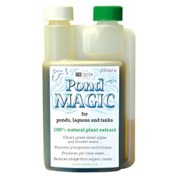 Pond Magic clears green water algae and blanket weeds, removes phosphates and nitrates, reduces sludge from organic matter and produces 'gin clear' water to enhance viewing. Use 10ml of Pond Magic for every 2500 litres of water, once a day for 7 days and then once weekly thereafter. To calculate how much Pond Magic you will require you can download our dosage calculator - An interactive Excel file. Pond magic works by invigorating bacteriological activity within the pond water and can also be used in water butts to keep the water clear. All Magic products are made from 100% plant extract, which means they're kind to the environment and harmless to all animal, aquatic and plant life. ** IMPORTANT DELIVERY INFORMATION** - Please note that we are unfortunately unable to deliver to the following postcode areas: IV3-IV40, IV52-IV54, IV63, KW1-KW14, PA20-PA40, PH19-PH40,PH50, IV41-IV51, IV55-IV56, KA27, KA28, KW15-KW17, PA41, PA42-PA49, PA60, PA61, PA62-PA76, PA77, PA78, PH41-PH44. All HS and all ZE postcodes along with areas within the Scottish Highlands & Islands, Channel Islands, Isle of Man, Isles of Wight, Northern Ireland and the Channel Islands.