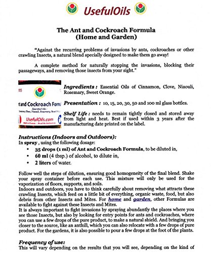 The formula contains many natural compounds with recognized insecticidal and insect repellent properties, produced by plants to protect themselves from insects that parasitize them. The essential oils obtained after distillation of the parts of plants containing those active substances concentrate those compounds and their effects.Ingredients: Pure essential oils of Cinnamon (Cinnamomum zeylanicum, leaves and bark), Clove (Syzygium aromaticum), Niaouli (Melaleuca quinquenervia), Rosemary (Rosmarinus officinalis), Sweet Orange (Citrus sinensis).Spray preparation: 35 drops of the Ant and Cockroach Formula are to be diluted in 60 ml (4 tablespoons) of alcohol. This solution is then diluted in 2 liters of water in a vaporizer.Instructions: It is always important to fight against invasions, by spraying abundantly the places where you see the Insects, but also by looking for the entry points of the ants and cockroaches, where you can use a few drops of the pure product, to make a shield. And bringing you closer to the source, like an anthill, which you can also relocate with a few drops of pure product. For the gardens, it is also possible to pour a few drops at the foot of the plants. Mechanism of action: Entomological studies in the field of bio-pesticides have specifically demonstrated the synergistic actions of three natural substances eugenol, cinnamaldehyde and ?-terpineol on the receptors of the nervous system of those insects. Eugenol and eucalyptol have also been tested to reduce the invasive activity of these insects as repellents. The laboratory joins the traditional use of cinnamon sticks as repellents. Camphor and limonene, less specific, potentiate the effects of other substances, allowing their use in small doses, maintaining visible results.This formulation has also been very effective against termites and silverfish.Supplied with a dropper cap. Read the attached leaflet.