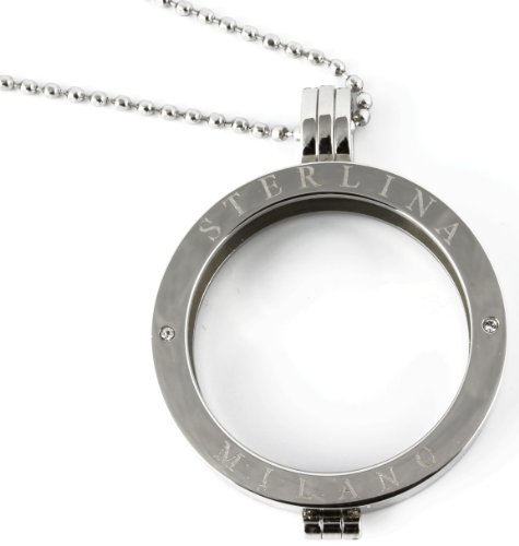 Interchangable Coin Pendant. The latest fashion accessory consisting of a silver coloured stainless steel locket with two stones and Sterlina Milano branding on both sides making the locket reversible (please see pictures). Inside the locket are a backing stone and a tree coin. These lockets are the latest must have accessory, you can buy more coins to change the look of the pendant to suit your mood or outfit. The two coins are 33mm diameter and the locket is 37mm, the chain is a 2mm diamond cut ball chain the same colour as the locket and is available in various lengths which can be selected above. Please see the photo of the chain, it looks thicker in the photo than it is as it is zoomed in, the chain is approximately 2mm thick.