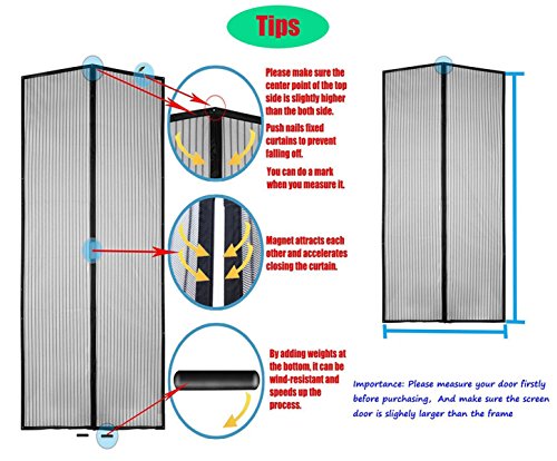 1)Please clean the doorframe surface before installation,to make sure that no dust or grease on the joints between doorframe and Seal. 2)Please flatten out the magnetic screen door,check if there is any dust on each border.Please clean if any dust exists to ensure it will not affect Hook and loop fastener's stickiness. 3)Tear one side of the protective magic tape and stick the magnetic screen door to the doorframe.Please make sure that all the magnetic screen door's magic tapes stick to the doorframe's magic tapes tightly. 4)Of course you can use those thumbtacks we offered free to fix the magnetic screen door to the doorframe.Please be noted: Those thumbtacks may damage your doorframe. 5)Please ensure the center of the top mesh slightly higher than two sides.Don't let too much screen put on the floor, it will impact the effect of closing. meanwhile, don't let screen hang in the air, because the insect Will come into. 6)Finish the installation!You can enjoy it right now!