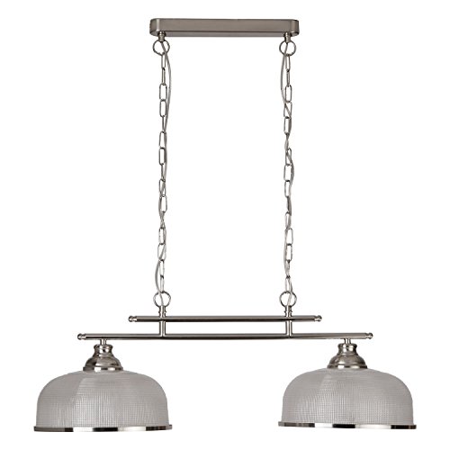 This Searchlight two light bar ceiling light is finished in satin silver and comes complete with glass shades. This stunning light is suspended on chains and the ribbed acid glass shades make this a striking light. It would look equally incredible in a cafe or bar, or indeed over a kitchen worktop or island. Suspending from a solid and sturdy ceiling bar, the chunky satin silver chain reaches 2 bars before reaching the lights. From the bistro collection, this 2 light item exudes sophistication and is perfect for a classic home setting. The ribbed halophane glass is complemented by a satin silver trim.