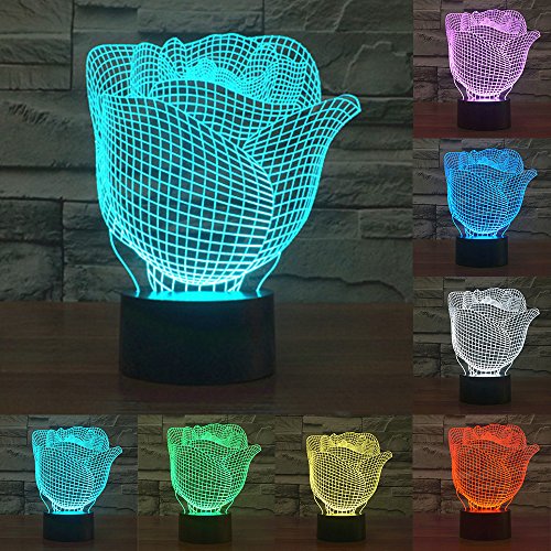 Perfect Gift for Kids, Dads, Boys, Friends, Wife. This amazing Rose Flower 3D Illusion Smart Touch Night Light with 7 Colors Change is sure to impress. Everyone is looking for something a bit different these days whether its to gift for a Birthday, New Baby Gift, Christmas or just a way of saying thank you. We feel we have that something DIFFERENT here for you, stunningly simple yet effective as a Night Light, Mood Light or as a piece of decoration in your house or office. The Starbright LED range of 3D Illusion lights brings a two dimensional image to LIFE. All of our lights are made from a thin sheet of acrylic Perspex which has been laser cut to create a light emitting 3D effect. See thru during the day but in the dark and with the light on, it creates a beautiful optical illusion which is both functional and a great design piece that everyone will love. Main Features: * Power:0.5W * Voltage: 5V * Weight: approx 0.4kg * Power spend: 0.012kw.h/24 hours * LED life span: 10000hours * Panel Material: Acrylic * Base size: approx 87*87*43mm * Package size: approx 26*20*6cm How to use: 1. Insert acrylic panel into the LED base 2. Connect the 3D light with power via USB cable 3. Press touch button to choose colour and working mode Note: The Auto Colour Changing Mode is the Colour changing Gradient, when you touch the switch after 7 single colour settings, then the next touch will initiate automatically colour changing mode. Packaging details: 1 x Acrylic Flat 1 x ABS Base 1 x USB Cable 1 x Manual