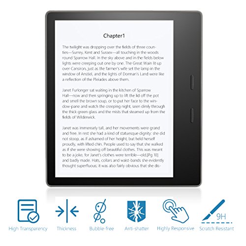 iThrough® Kindle Oasis Screen Protector(9th Generation, 2017),Tempered Glass Screen Protector for All-New Kindle Oasis Description ONLY designed for your Kindle Oasis(9th Generation, 2017) 9H Hardness, harder than a knife's blade. You can say goodbye to any possible scratches by keys, knife or other sharp objects. 99.99% light transmission Ratio, provide great viewing experience with more brightness and less glare. Thickness maintains high response to original response sensitivity, which ensures quick APP launch, smooth games and video playing. The Microfiber hydrophobic coating largely reduces smudges and fingerprint. You keep your screen clean by a simple wipe. Warm Note: Compatible with All-New Kindle Oasis (9th Generation 2017 Release) tablet, NOT fit for other tablets Features: - Scratch Terminator and Anti-shatter - High Transparency - High Response - Easy Bubble Free Installation - Smudges and Fingerprint Resistant Package Included 1* iThrough® Tempered Glass Screen Protector for Kindle Oasis Tablet(2017)