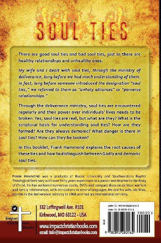There are good soul ties and bad soul ties, just as there are healthy relationships and unhealthy ones. My wife and I dealt with soul ties, through the ministry of deliverance, long before we had much understanding of them. In fact, long before someone introduced the designation "soul ties," we referred to them as "unholy alliances" or "perverse relationships." Through the deliverance ministry, soul ties are encountered regularly and their power over individuals' lives needs to be broken. Yes, soul ties are real, but what are they? What is the scriptural basis for understanding soul ties? How are they formed? Are they always demonic? What danger is there in soul ties? How can they be broken? In this booklet, Frank Hammond explains the root causes of these ties and how to distinguish between Godly and demonic soul ties.